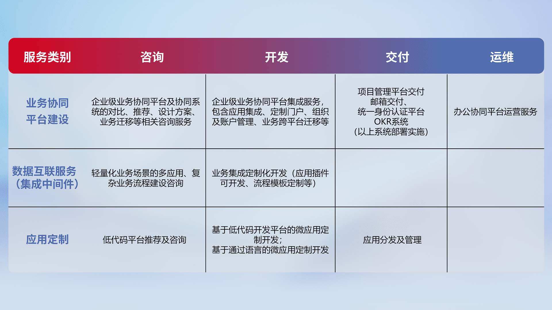 针对钉钉、、、、企微、、、IDaas等平台级产品提供产品的规划、、方案、、、、交付、、、、定制化开发等服务,,,,实现如统一协同办公、、智能客户服务、、混合会议管理、、、、智能数据查询、、等业务场景,,,实现数字化转型。。